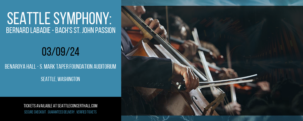 Seattle Symphony: Bernard Labadie - Bach's St. John Passion is coming to Seattle in 2024! Listen to their toe-tapping tunes and their soul-stirring lyrics, in what is heralded to be one of the leading acts of the year. Enjoy an evening of their number 1 hits as well as some of their exciting new material. Sing along to their soulful songs, experience the powerful sound of Seattle Symphony: Bernard Labadie - Bach's St. John Passion and dance the night away! Seattle Symphony: Bernard Labadie - Bach's St. John Passion will be LIVE ON STAGE at Benaroya Hall in Seattle, Washington on Saturday 9th March 2024. Benaroya Hall brings you the best live performances and shows, witness the magical sound of this awesome act in person. Bring your friends, camera and seize the night together.